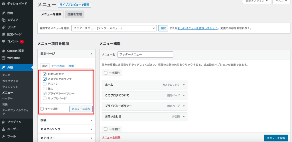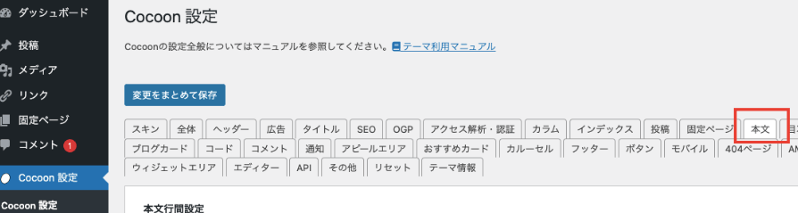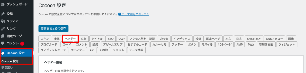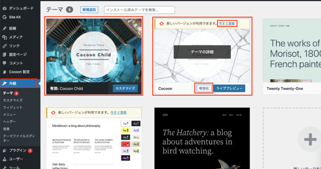 1.外観>テーマで【Cocoon】テーマがインストール、有効化されていることを確認します。