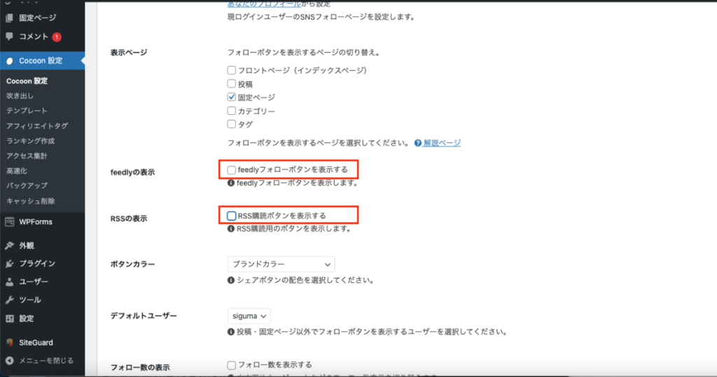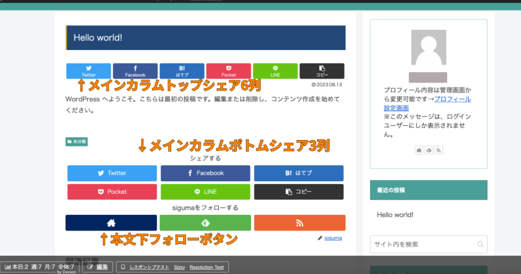 SNSシェア・フォローの表示、種類を変更します。ここでは例としてメインカラムトップシェアのみの表示に変更します。