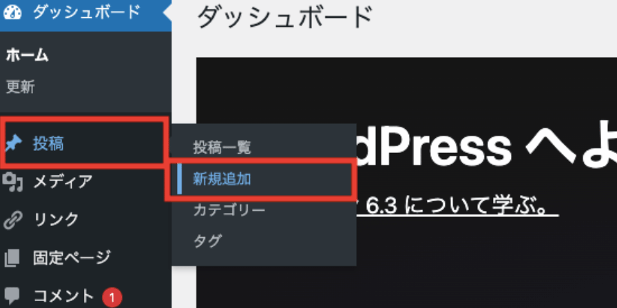ダッシュボードの投稿>カテゴリーまたはタグから新規追加することも可能です。