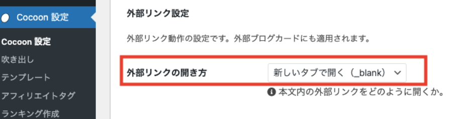 最初にリンクに飛んだ際に新しいタブを開く設定をします。