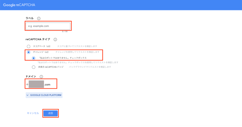 4.Google’s reCAPTCHA admin consoleにアクセスし、キー取得を行います。ラベルにドメイン名を入力し、チャレンジにチェックを入れ送信をクリックします。